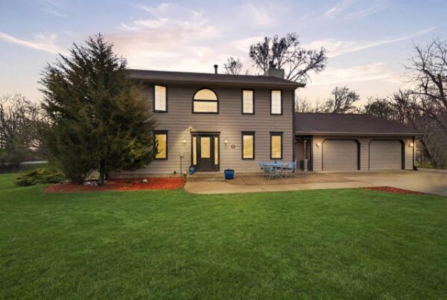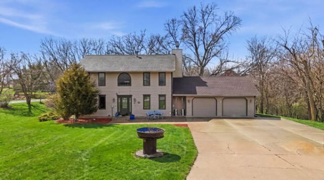 Nestled on a beautiful 1 1/4-acre wooded lot with mature trees, this spacious two-story home offers privacy, comfort, and convenient access to nearby amenities. With approximately 3163 finished sq ft plus additional storage, the home provides plenty of space for everyday living and entertaining. The main level features a bright, open floor plan with a spacious kitchen that flows seamlessly into the living and dining areas-perfect for gatherings and family life. A main-floor laundry room adds everyday convenience. This home includes 3 bedrooms plus a dedicated study, along with several non-conforming rooms that can be used for hobbies, guests, exercise, or additional workspace. The finished walkout lover level expands the living area and provides easy access to the scenic backyard. Enjoy cozy evenings by two fireplaces-one gas and one wood burning, offering both ambiance and warmth throughout the seasons. Located on a beautifully wooded lot with mature trees, the property provides a peaceful, natural setting while remaining just minutes from I-35 for easy commuting. A rare combination of space, privacy, and location, this home offers the perfect blend of comfortable living and natural surroundings.New water heater, new interior paint, new deck, new retaining walls and mulch. Come take a look at all there is to offer on your private oasis! Photos have been enhanced to add the look of fully grown grass. Arial view shows the property with all of the areas of the property.